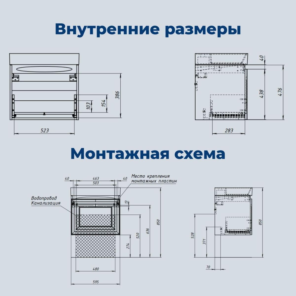 Внутренние детали выполнены из влагостойкой ЛДСП в цвете антрацит. Дно ящика сделано из прочной ЛДСП толщиной 16 мм. Ящик вместительный — его полезная высота составляет 380 мм. Задняя стенка уменьшена, но при этом отсутствует вырез под сифон, что увеличивает полезное пространство.