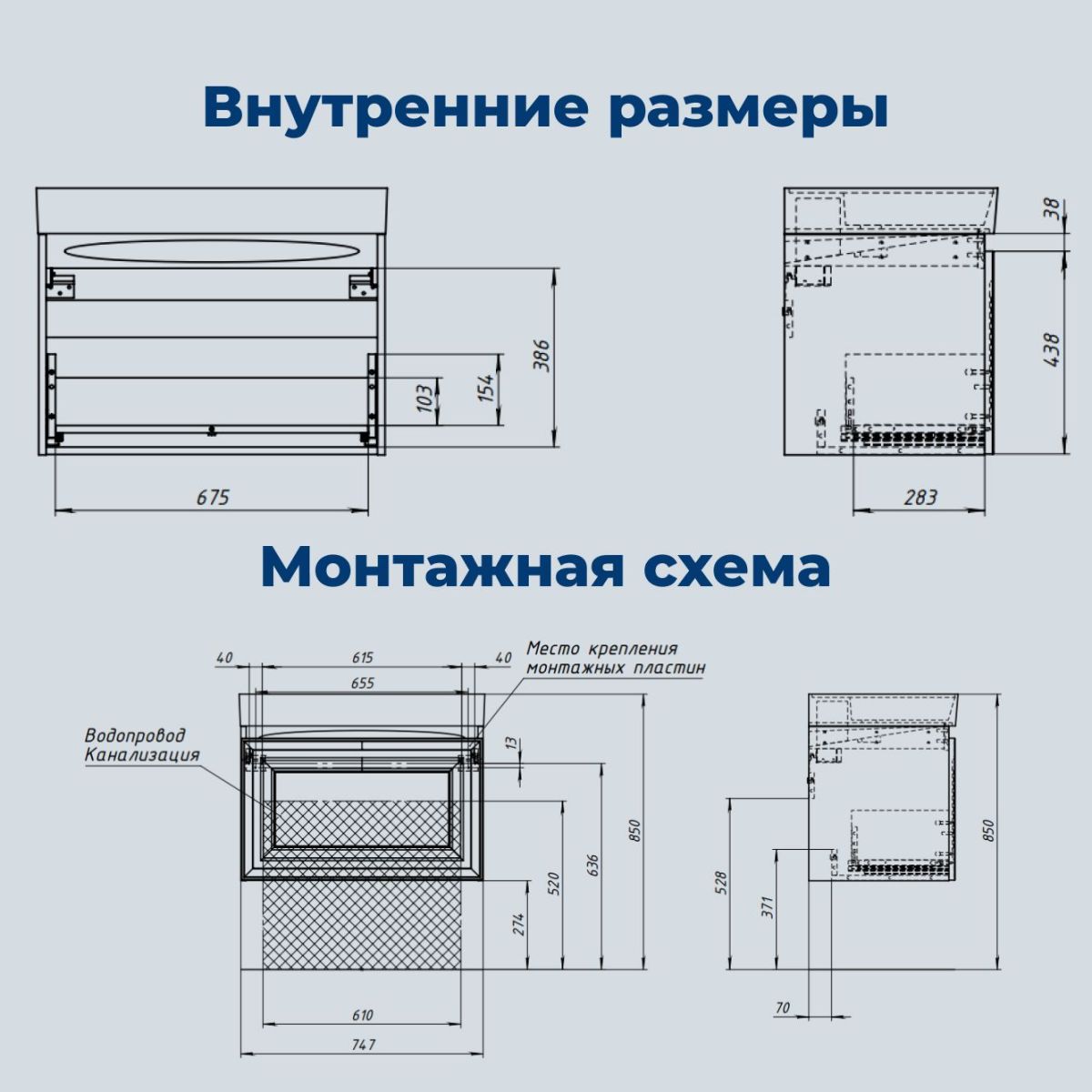 Внутренние детали выполнены из влагостойкой ЛДСП в цвете антрацит. Дно ящика сделано из прочной ЛДСП толщиной 16 мм. Ящик вместительный — его полезная высота составляет 380 мм. Задняя стенка уменьшена, но при этом отсутствует вырез под сифон, что увеличивает полезное пространство.