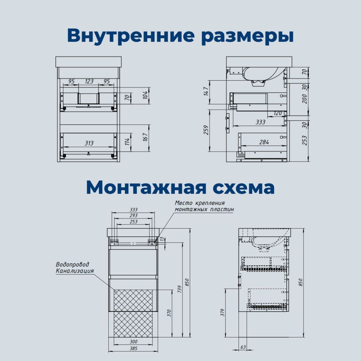 За нижним ящиком предусмотрено место для подводки коммуникаций снизу. Это упрощает монтаж и скрывает трубы. Подвесные модели можно установить на универсальные опоры высотой 200 мм.