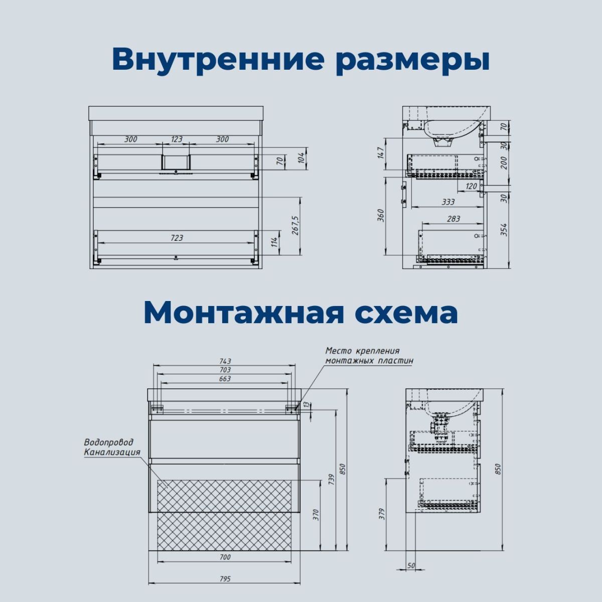 За нижним ящиком предусмотрено место для подводки коммуникаций снизу. Это упрощает монтаж и скрывает трубы. Подвесные модели можно установить на универсальные опоры высотой 200 мм.