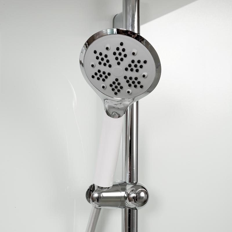 Стильная душевая кабина AvaCan EM 1580 сочетает в себе высокую функциональность, практичность и надежность. Для изготовления применяют безопасное закаленное стекло толщиной 5 мм, надежно фиксируемое алюминиевым профилем. Цвет профиля хром. В комплекте зеркало, душевой гарнитур, переключатель режимов, смеситель, тропический (верхний) душ, деревянная вставка в поддон, полочки, тропический (верхний) душ.