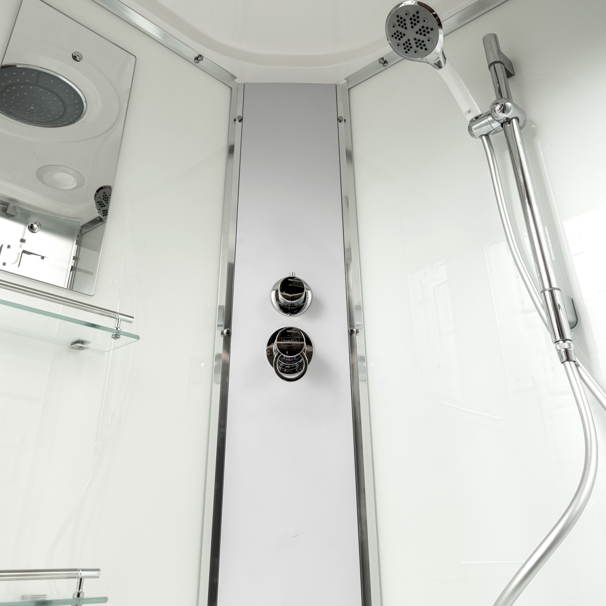 Стильная душевая кабина с внутренней сборкой AvaCan EM 2012 R сочетает в себе высокую функциональность, практичность и надежность. Для изготовления применяют безопасное закаленное стекло толщиной 5 мм, надежно фиксируемое алюминиевым профилем. Цвет профиля хром. В комплекте зеркало, переключатель режимов, смеситель, тропический (верхний) душ, полочки, тропический (верхний) душ, вставка в поддон.