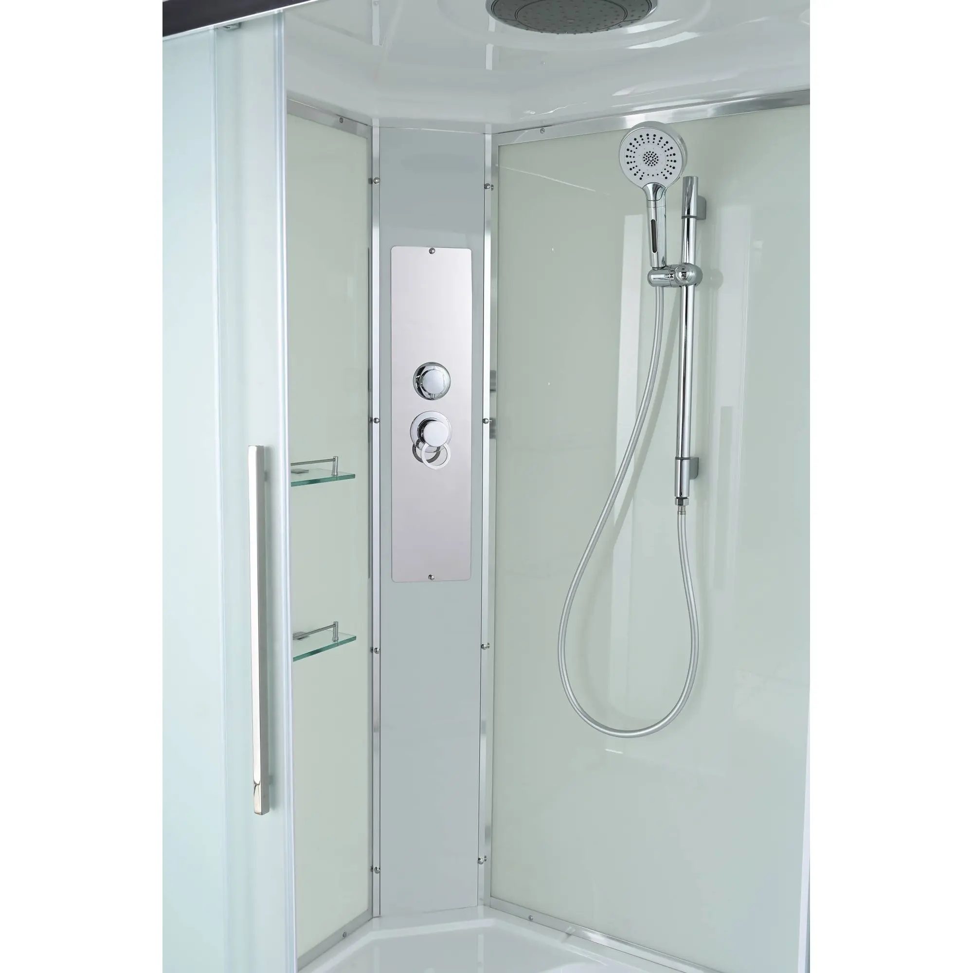 Стильная душевая кабина AvaCan сочетает в себе высокую функциональность, практичность и надежность. При изготовлении применяется безопасное закаленное стекло, надежно фиксируемое алюминиевым профилем. Профиль сделан из алюминия повышенной прочности. Сборка без силикона (увеличивает срок службы, защищает от протечек), внутренняя сборка (облегчает установку и ревизию; позволяет установить в ограниченном пространстве и обойтись без демонтажа других сантехнических приборов), смеситель резьбовой (без хомутов). Съемный экран поддона (позволяет осуществлять подключение и ревизию сифона).Двойные металлические ролики дверей (распределение нагрузки на два ролика, увеличивают срок службы). Душевая штанга(позволяет регулировать по высоте ручную лейку), ручная арома-лейка с витамином С (картридж в комплекте,есть возможность замены или удаления картриджа), полочки(из стекла, с ограничителем), сифон с гидрозатвором.