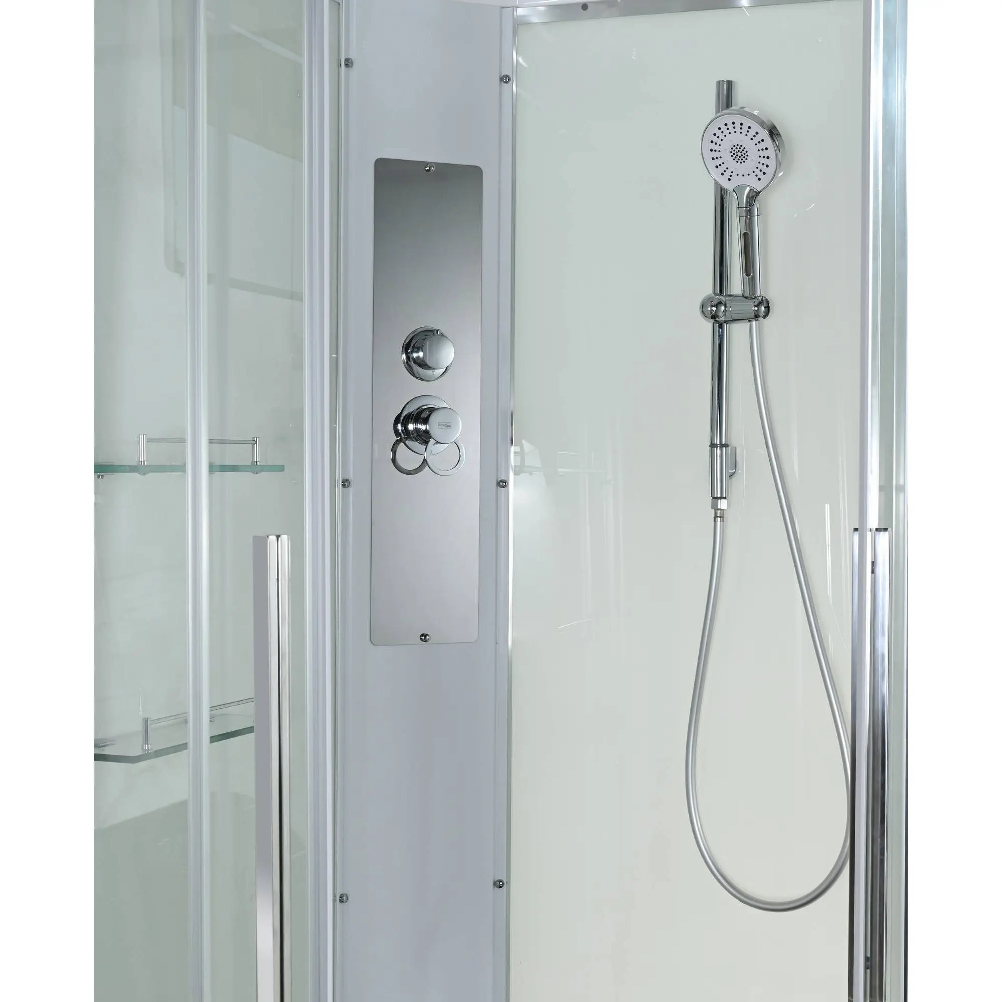 Стильная душевая кабина AvaCan сочетает в себе высокую функциональность, практичность и надежность. При изготовлении применяется безопасное закаленное стекло, надежно фиксируемое алюминиевым профилем. Профиль сделан из алюминия повышенной прочности. Сборка без силикона (увеличивает срок службы, защищает от протечек), внутренняя сборка (облегчает установку и ревизию; позволяет установить в ограниченном пространстве и обойтись без демонтажа других сантехнических приборов), смеситель резьбовой (без хомутов). Съемный экран поддона (позволяет осуществлять подключение и ревизию сифона).Двойные металлические ролики дверей (распределение нагрузки на два ролика, увеличивают срок службы). Душевая штанга(позволяет регулировать по высоте ручную лейку), ручная арома-лейка с витамином С (картридж в комплекте,есть возможность замены или удаления картриджа), полочки(из стекла, с ограничителем), сифон с гидрозатвором.