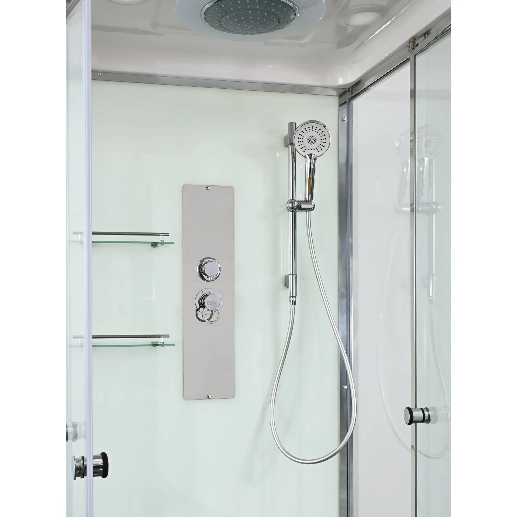 Стильная душевая кабина AvaCan сочетает в себе высокую функциональность, практичность и надежность. При изготовлении применяется безопасное закаленное стекло, надежно фиксируемое алюминиевым профилем. Профиль сделан из алюминия повышенной прочности. Сборка без силикона (увеличивает срок службы, защищает от протечек), внутренняя сборка (облегчает установку и ревизию; позволяет установить в ограниченном пространстве и обойтись без демонтажа других сантехнических приборов), смеситель резьбовой (без хомутов).Двойные металлические ролики дверей (распределение нагрузки на два ролика, увеличивают срок службы). Душевая штанга(позволяет регулировать по высоте ручную лейку), ручная арома-лейка с витамином С (картридж в комплекте,есть возможность замены или удаления картриджа), полочки(из стекла, с ограничителем), сифон с гидрозатвором.