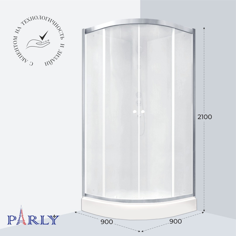 Современный дизайн. Модельный ряд кабин PARLY представлен в различных стилях, конфигурациях и цветах, а также с различными формами поддонов. Поэтому можно индивидуально подобрать кабину практически для любого дизайнерского решения. Презентабельный вид кабинам придают закаленные стекла, которые способствуют надежности и не боятся химических средств, что позволяет дольше сохранить их внешнюю привлекательность.