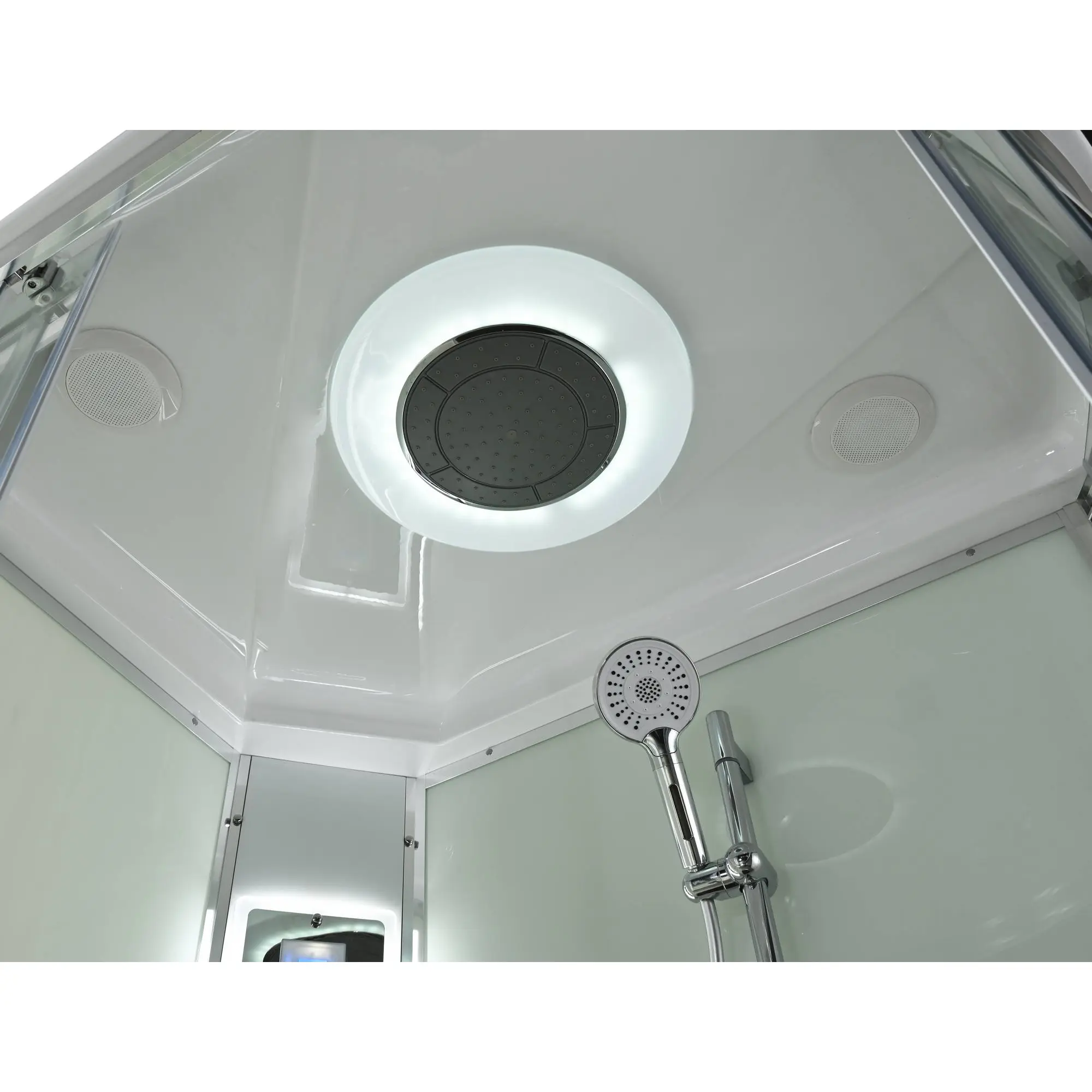 Стильная душевая кабина AvaCan EM2811LLEDT сочетает в себе высокую функциональность, практичность и надежность. При изготовлении применяется безопасное закаленное стекло толщиной 5 мм (прозрачное), надежно фиксируемое алюминиевым профилем. Сборка без силикона (увеличивает срок службы), внутренняя сборка(облегчает установку и ревизию; позволяет установить в ограниченном пространстве), смеситель резьбовой (без хомутов). Съемный экран поддона (позволяет осуществлять ревизию сифона). Цвет профиля хром. Двойные металлические ролики дверей (увеличивают срок службы).В комплекте : душевая штанга, две полочки , тропический (верхний) душ, арома-лейка с витамином С (картридж съемный),полимерная вставка в поддон(имитация дерева),сифон, ручки дверей из нержавейки , двойные ролики ,пульт сенсорный(Блютуз ,LED подсветка ,радио ,вытяжка),гидромассаж спины.
