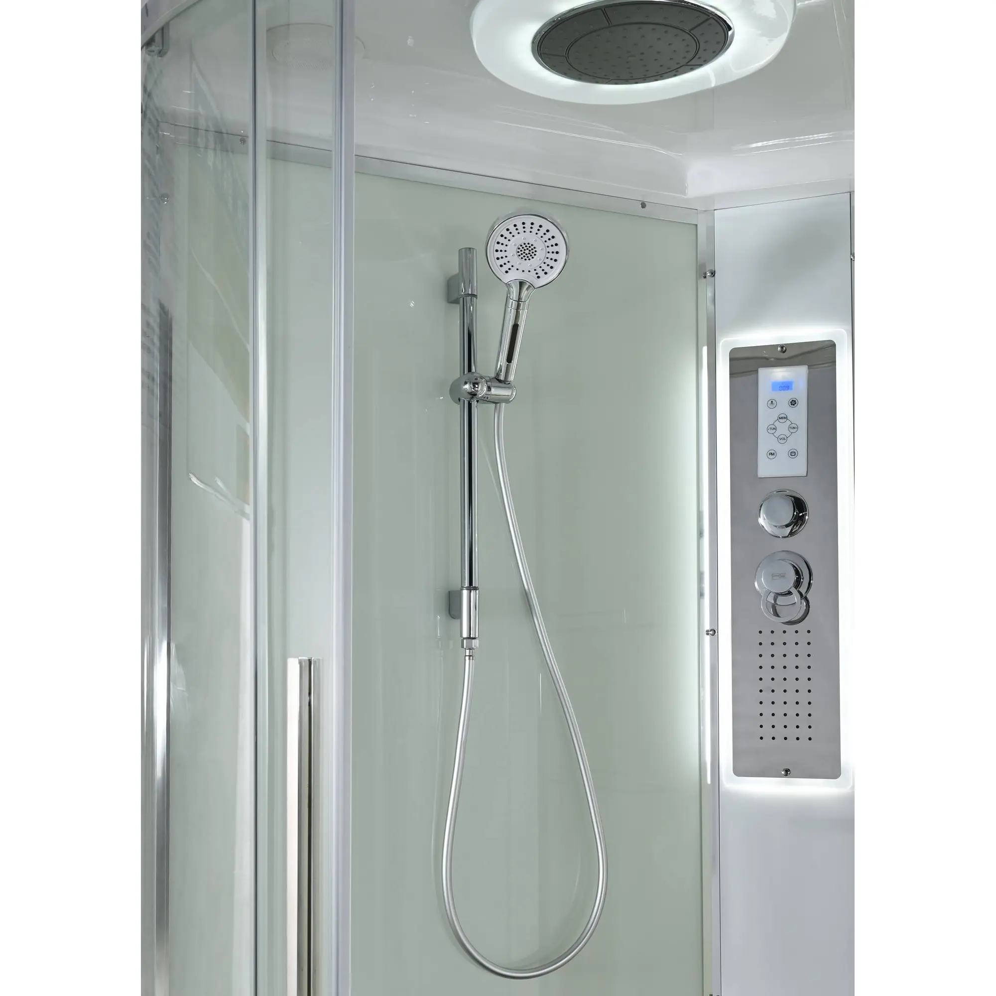 Стильная душевая кабина AvaCan сочетает в себе высокую функциональность, практичность и надежность. При изготовлении применяется безопасное закаленное стекло, надежно фиксируемое алюминиевым профилем.Профиль сделан из алюминия повышенной прочности. Сборка без силикона (увеличивает срок службы, защищает от протечек), внутренняя сборка (облегчает установку и ревизию; позволяет установить в ограниченном пространстве и обойтись без демонтажа других сантехнических приборов), смеситель резьбовой (без хомутов). Съемный экран поддона (позволяет осуществлять подключение и ревизию сифона).Двойные металлические ролики дверей (распределение нагрузки на два ролика, увеличивают срок службы). Душевая штанга(позволяет регулировать по высоте ручную лейку), ручная арома-лейка с витамином С (картридж в комплекте,есть возможность замены или удаления картриджа), полочки(из стекла, с ограничителем), сифон с гидрозатвором, сенсорный пульт управления с функциями: блютуз, LED подсветка, радио, вытяжка, гидромассаж спины, тропический (верхний) душ.