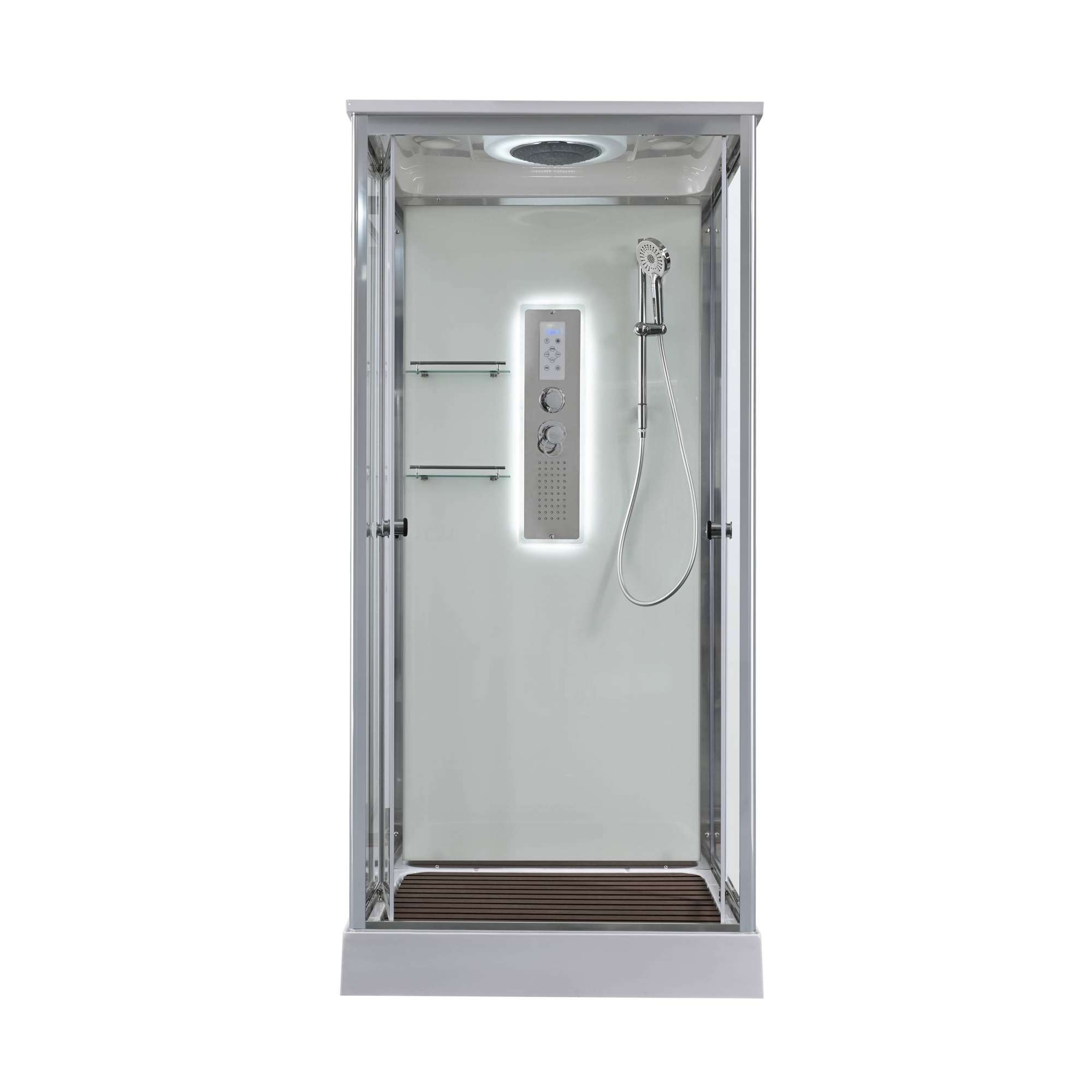 Стильная душевая кабина AvaCan сочетает в себе высокую функциональность, практичность и надежность. При изготовлении применяется безопасное закаленное стекло, надежно фиксируемое алюминиевым профилем.Профиль сделан из алюминия повышенной прочности. Сборка без силикона (увеличивает срок службы, защищает от протечек), внутренняя сборка (облегчает установку и ревизию; позволяет установить в ограниченном пространстве и обойтись без демонтажа других сантехнических приборов), смеситель резьбовой (без хомутов). Двойные металлические ролики дверей (распределение нагрузки на два ролика, увеличивают срок службы). Душевая штанга(позволяет регулировать по высоте ручную лейку), ручная арома-лейка с витамином С (картридж в комплекте,есть возможность замены или удаления картриджа), полочки(из стекла, с ограничителем), сифон с гидрозатвором, сенсорный пульт управления с функциями: блютуз, LED подсветка, радио, вытяжка, гидромассаж спины, тропический (верхний) душ.